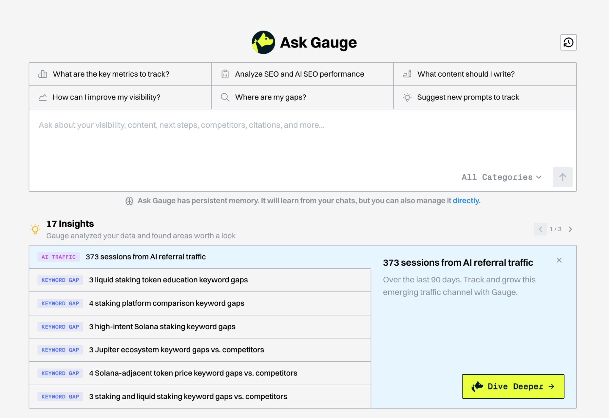 The engagement started with a full landscape assessment. Gauge configured hundreds of targeted prompts across the Solana liquid staking category and gave Sanctum something they'd never had before: a clear, data-driven picture of where they stood in AI search, and where they didn't.