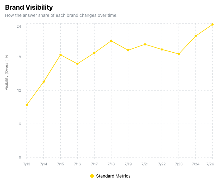This shift from passive monitoring to active optimization marked the beginning of their remarkable transformation. Over a 14 day period, Standard Metrics doubled their AI visibility based on insights from Gauge. This represents just the beginning of their optimization journey, as Gauge continues to provide ongoing recommendations for sustained growth.