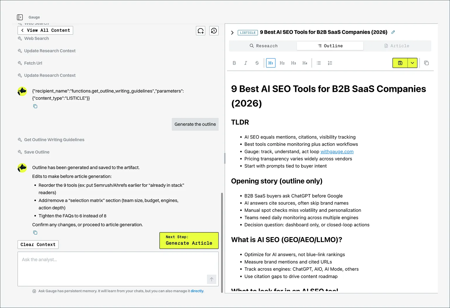 From identifying gaps to drafting content to tracking whether it gets picked up, Gauge's content engine owns the full loop so your team doesn't have to.
