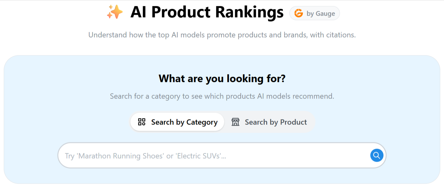 The Gauge team also built ProductRank.ai, a free tool that shows exactly how AI models rank products and brands in any category. Simply search for any product category (such as "CRM software" or "running shoes"), and it queries ChatGPT, Claude, Perplexity, and Gemini to show you how each AI model ranks different brands, the exact order in which products appear in recommendations, and which citations influenced each ranking.