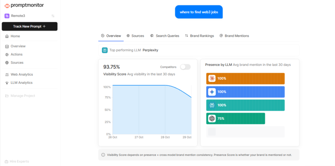 - Prompt-level analytics showing which queries trigger brand mentions