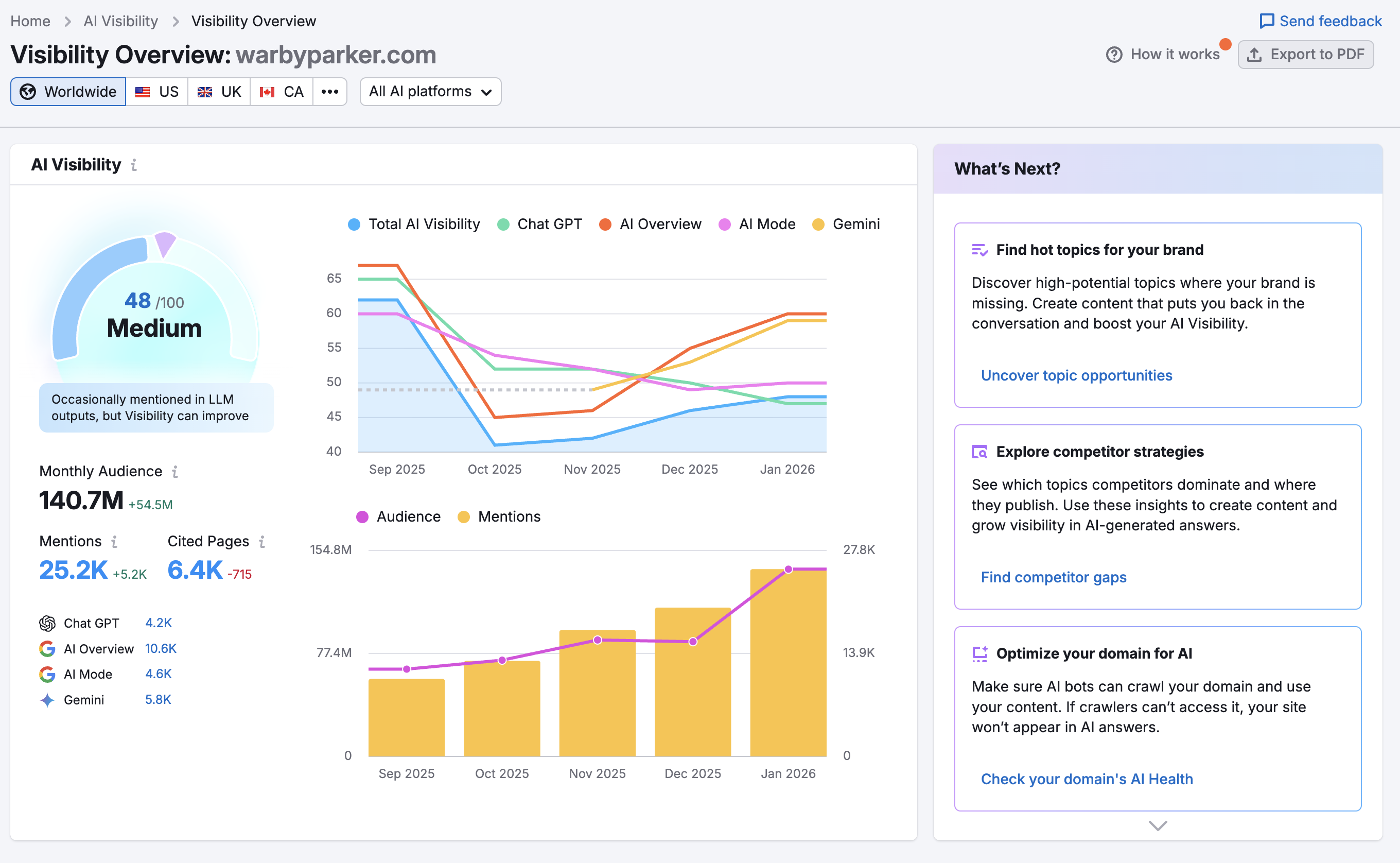 - Six-platform coverage monitors ChatGPT, Gemini, Perplexity, CoPilot, AI Mode, and AI Overviews in a single dashboard, eliminating the need to cobble together multiple tools.